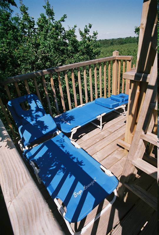 - Terrasse de 5m² équipée de 2 transats bains de soleil (en option*) cotôyant la cime des chênes